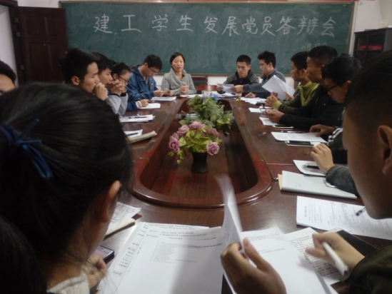 答辩同学由大四到大二按专业顺序依次进行答辩。答辩分为个人自述,理论知识必答,自由问答三个环节:首先由答辩对象就自己入党动机、学习成绩、学生工作和集体贡献,近一年来取得的突出成绩以及自身的缺点和不足等方面进行介绍。在理论知识必答环节,答辩对象从题库中随机抽取题目进行回答。题目内容丰富,涵盖了党章党史、时事政治以及大学生日常生活中遇到的热点问题,充分考察了发展对象的理论水平以及对社会热点的观察和分析能力。答辩评委依据汇报内容、答辩评委对每个答辩对象进行了认真评分。会后再根据答辩成绩和前面几个学年的学分绩点,结合平时表现,选出最终人选。