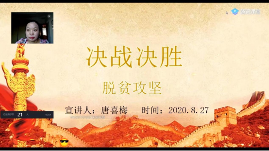 本次党课由唐喜梅老师主讲,党课主题为:决战决胜-脱贫攻坚。 党课背景:习近平主席3月6日在京出席“决战决胜脱贫攻坚”座谈会并发表重要讲话,讲话中充分肯定了脱贫攻坚取得的成绩,分析了脱贫攻坚面临的形势,对加强党对脱贫攻坚的领导,进一步坚定了全党全社会坚决打赢脱贫攻坚战的信心决心。