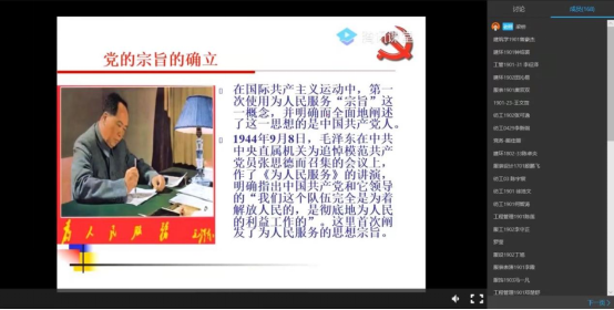 4月10日晚7点,建筑工程学院、纺织服装学院全体165名入党积极分子齐聚线上共上一堂党课。建筑工程学院梁桥书记以“党的宗旨和党的作风”为题为建筑工程学院和纺织服装学院的全体入党积极分子在线授课。 课堂伊始,梁桥书记通过分析当前世界疫情下各国的应对措施和方法,指出我国在应对疫情的措施与方法在目前来说相对是最好的,也是相对最有效的。梁桥书记为两院入党积极分子介绍了党的宗旨,指出了“人民”、“全心全意”、“谋”是为党的宗旨的三层含义。梁桥书记结合国情与党情,指出中国共产党的优良作风是党的生命,要牢记“两个务必”作风。课堂入尾,梁桥书记强调,青年是党的建设者和接班人,关系着祖国的前途,事业的成败,我们应当继承和发扬党的优良作风,学习学习再学习。