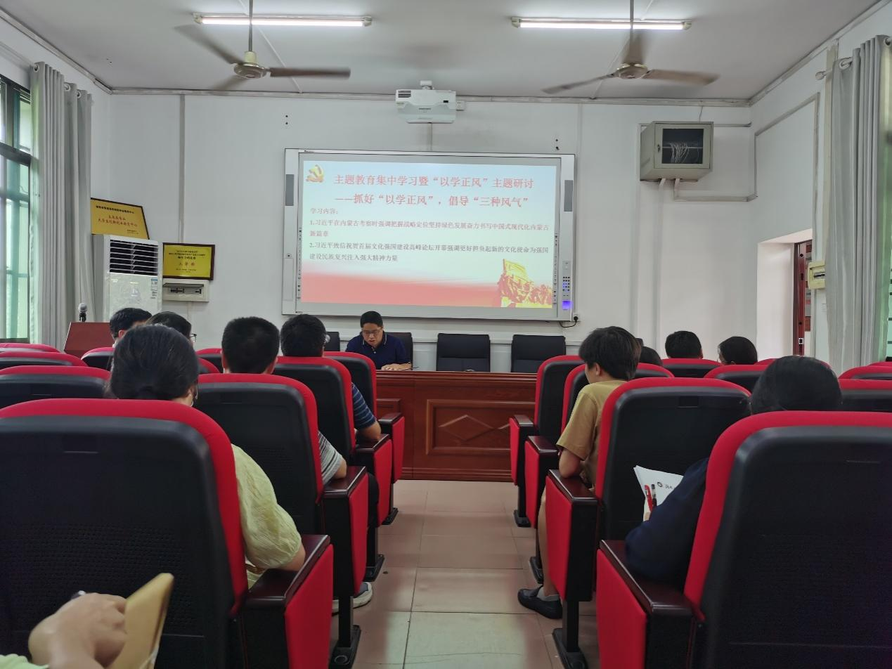 研讨活动集中学习了《习近平在内蒙古考察时强调把握战略定位坚持绿色发展奋力书写中国式现代化内蒙古新篇章》、《习近平致信祝贺首届文化强国建设高峰论坛开幕强调更好担负起新的文化使命为强国建设民族复兴注入强大精神力量》、《中国式现代化是中国共产党领导的社会主义现代化》、《李希:持之以恒学懂弄通做实习近平新时代中国特色社会主义思想在新征程上始终坚定拥护“两个确立”、坚决做到“两个维护”》、《沈晓明在主持十二届省委理论学习中心组第十九次集体学习“以学正风”专题研讨时强调把正党风强党性严党纪有机结合起来让务实清廉俭朴之风成为全省上下普遍自觉》、《向着大洋深处进军——“时代楷模”、湖南科技大学海洋矿产资源探采装备与安全技术国家地方联合工程实验室主任万步炎》;学习活动采取支委领学、党员跟学”的方式进行。