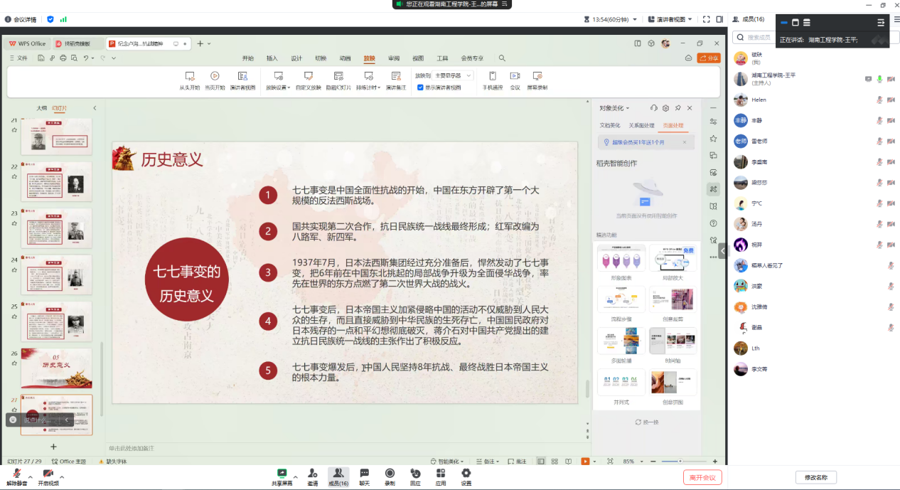 919926日,我院教工党支部线上线下结合开展了一月一课一片一实践围绕“铭记历史 砥砺前行”的内容,全体党员参加集学习分别由支部书记王平和彭第主持。