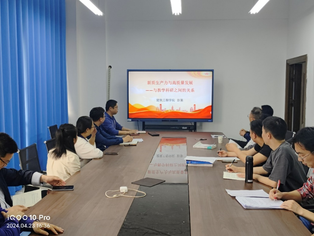 集中学习活动第二阶段,支部书记彭第以“新质生产力与高质量发展——与教学科研之间的关系”为题讲授一堂微党课。党课主要以“什么是新质生产力、新质生产力的主要内涵与重要意义、新质生产力与高质量发展的关系、教学科研如何推动新质生产力、教学科研如何促进专业高质量发展”五个方面进行讲解。围绕“135”工程实施方案上一堂关于“新质生产力与高质量发展”为主题,建议开展“党建+”模式,党建引领、党建赋能,以促进土木工程专业教学、科研及等各方面的发展,推动工程专业认证工作开展。