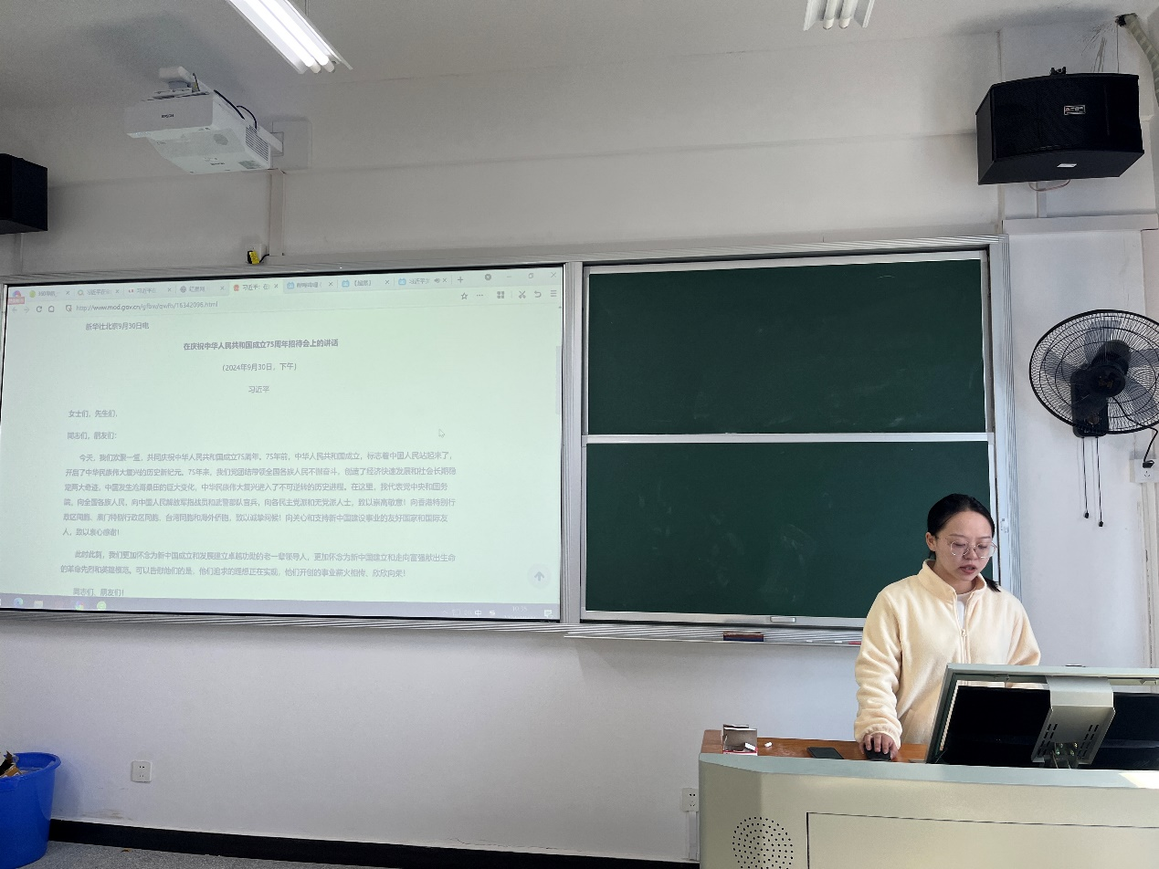 随后,观看了习近平在庆祝中华人民共和国成立75周年招待会上的讲话,学生党员何英杰表示:“通过这次讲话,我们可以感受到中国在新时代继续推进现代化建设的决心和信心。这不仅是对历史的回顾,更是对未来的展望,激励着全国人民为实现中华民族伟大复兴而不懈努力。”