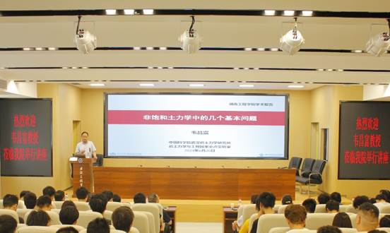 报告现场,韦昌富围绕土-水相互作用、孔压概念及其测量、化学-力学耦合理论、非饱和土两相流方程、非饱和土的有效应力等“非饱和土力学中的几个基本问题”这一主题,深入浅出地阐述了非饱和土力学的基本原理、研究方法以及在多领域的应用,并指出了当前非饱和土力学中尚未解决的一些科学问题和岩土工程前沿研究课题;他不仅分享了在岩土力学领域探索多年来的研究心得,还结合具体工程实例,详细讲解了岩土力学在工程建设中的实际应用和重要性,他强调,同学们要兆中培养从实际工程现象中提炼关键科学问题的能力。