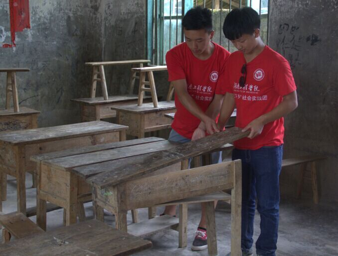 7月24日,在团队志愿者尹敏、陈嘉翔带领下,社会爱心人士陈小军和俞荣牧两人来到算子村。在了解了算子村小学教师配备,学生人数、成绩等情况及走访了就读于算子小学的学生家庭后,做出了一系列决定——向算子村小学捐赠100套课桌椅及书包等文具和后期的一对一扶帮计划。