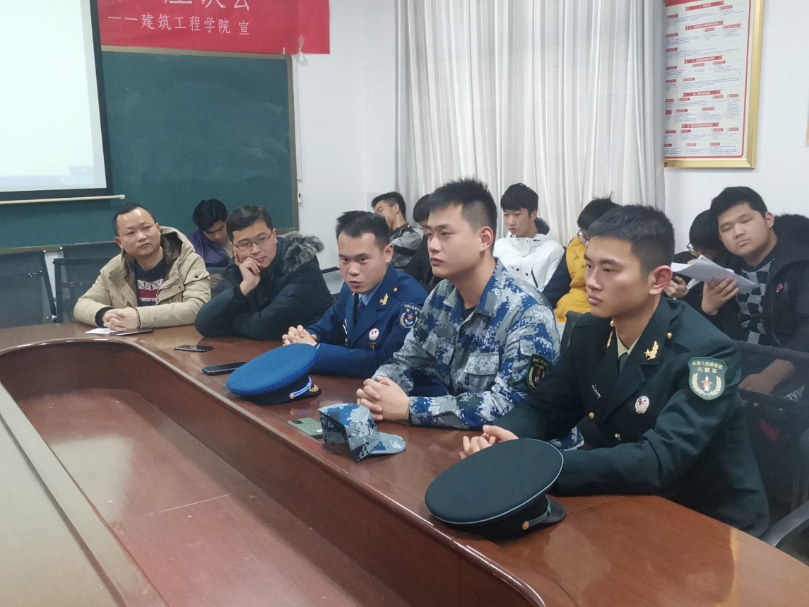 2020年12月25日下午3点,,建筑工程学院在第三教学楼会议室开展征兵宣传座谈会。党总支副书记梁桥、学生工作办公室主任李佳、退伍老兵邢程勇、陈鹏、肖正邦等与三十余名同学参加座谈,座谈会由李佳主持。