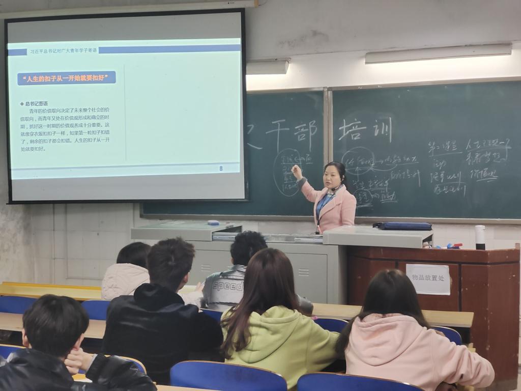 作为一名干部,我们要扣好扣子。干部们要将学习放在首位,更要在学习方面做好大家学习的榜样。在课堂上,干部们在学习上要积极主动,学会抓住课堂上的宝贵时间;在课后,也能够多与任课老师进行学术上的交流,树立好正面的干部形象。唐喜梅还提到:在课余生活中,我们还要关注第二课堂,积极地参加课外活动,以此来锻炼自己各方面的能力,比如,三下乡活动、创新创业活动等来丰富自己的大学课余生活。