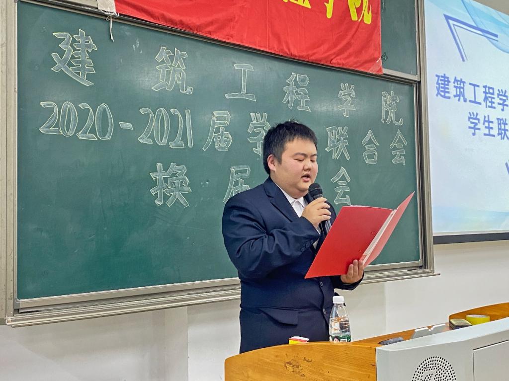 大会在建筑工程学院2020—2021届团总支副书记湛旺兴的演讲中拉开帷幕,他总结了去年学生联合组织工作的开展情况,分享了自己的感受和经验,并号召所有成员把学生联合组织建设得更好。