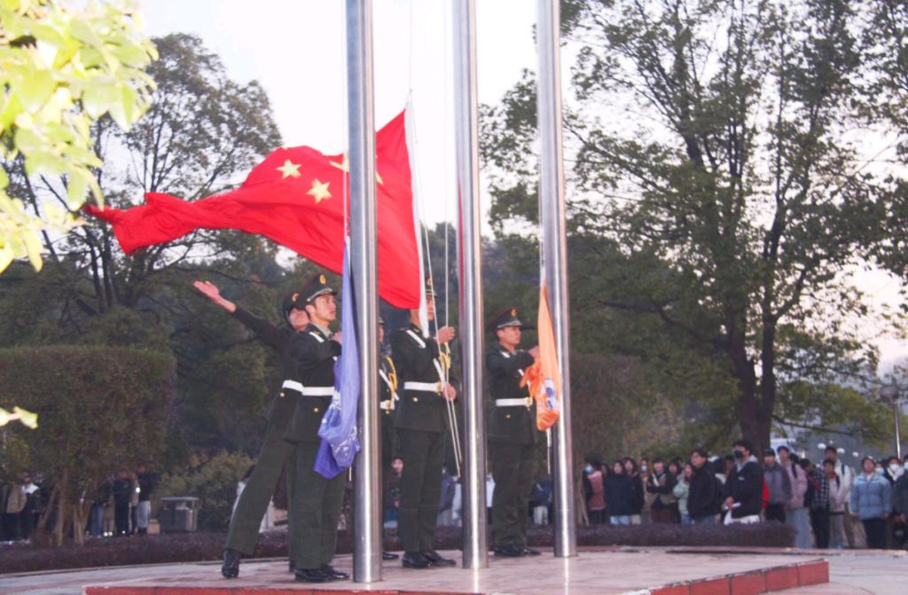 随着一声令下,国旗护卫队队员昂首挺胸、精神抖擞,迈着整齐有力的步伐走向升旗台。国歌奏响,升旗手振臂一挥,五星红旗冉冉升起。全体人员整齐肃立,高唱国歌,面向鲜红的五星红旗行注目礼.