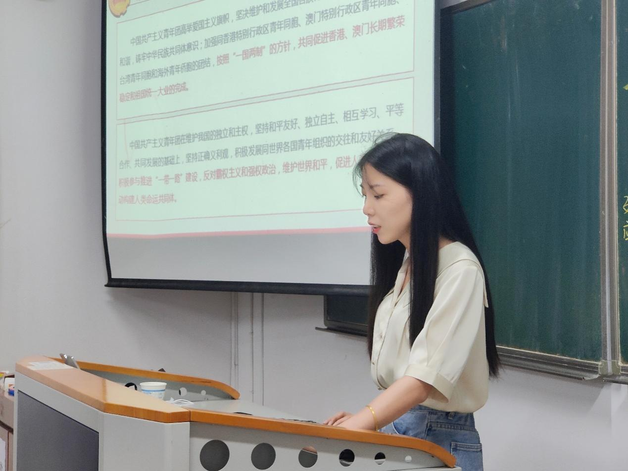 共青团是党的后备军,是党的事业的接班人和继承者!是中国共产党领导的先进的先进青年的群团组织,是紧跟党走在时代前列的先进组织。“人生万事须自为,跬步江山即寥廓。”周老师向广大团员干部和团员青年提倡:作为青年团员,传承红色基因,弘扬廉洁奉公的优良传统,我们责无旁贷。作为党的后备军的我们,要不断追求进步,这是青年最宝贵的特质,也是党和人民最殷切的希望,要认真接受政治训练、加强政治锻造、追求政治进步,积极向党组织靠拢,以成长为一名合格的共产党员为目标、为光荣。