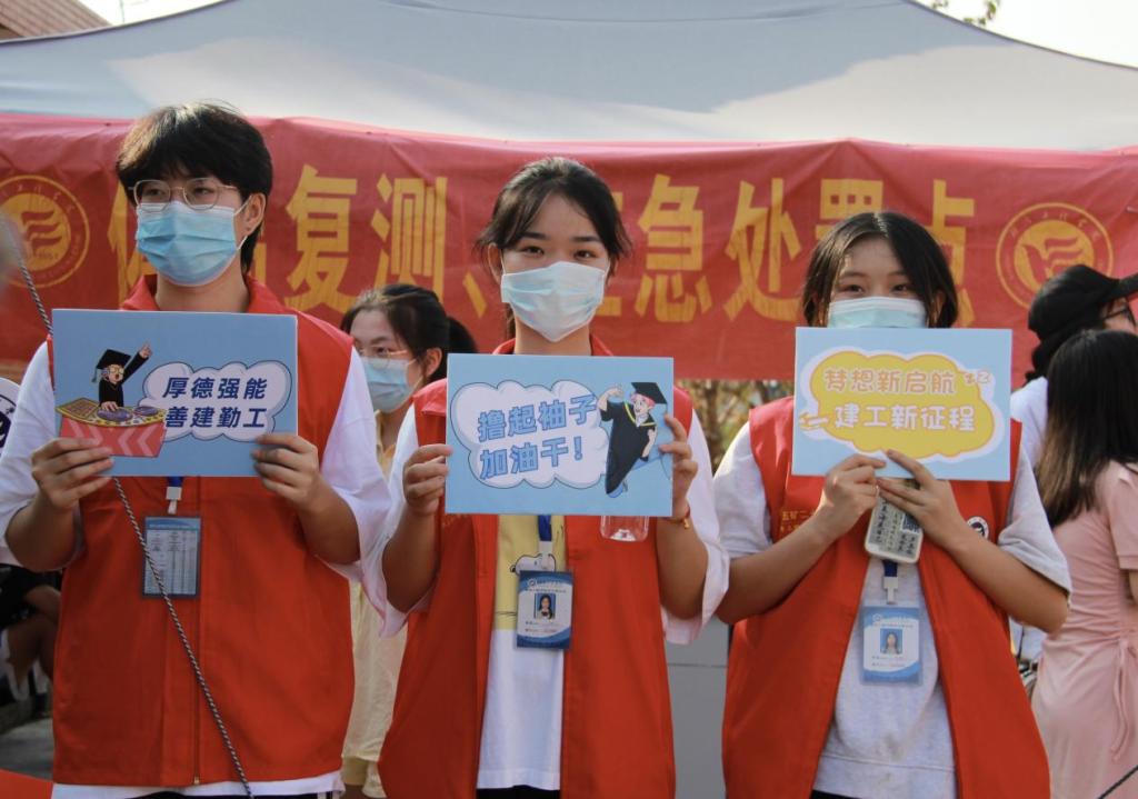 师生积极热情的精神面貌。“看见这么多穿红马甲的志愿者们帮忙搬送行李,我就放心了”,建筑学专业新生家长在校门口挥手送别。