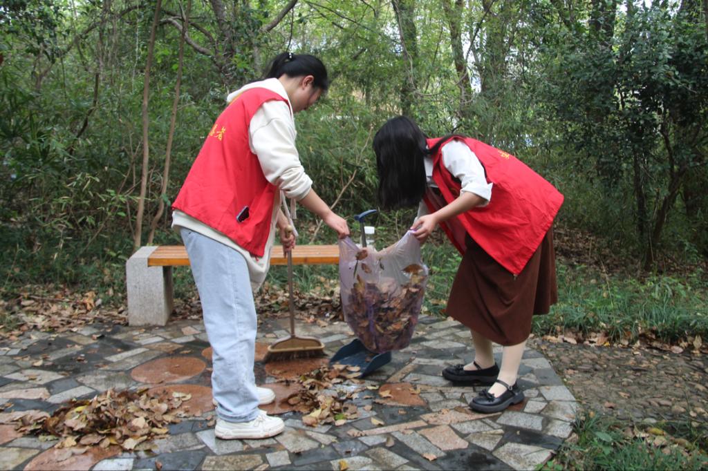 动员后,同学们对劳动内容和范围进行分配,他们拿着自备工具,对自己分配的区域进行了认真仔细的清扫,互相之间配合默契,同时将部分清扫的叶片进行了装袋,为之后的落叶堆肥做好树叶收集工作。