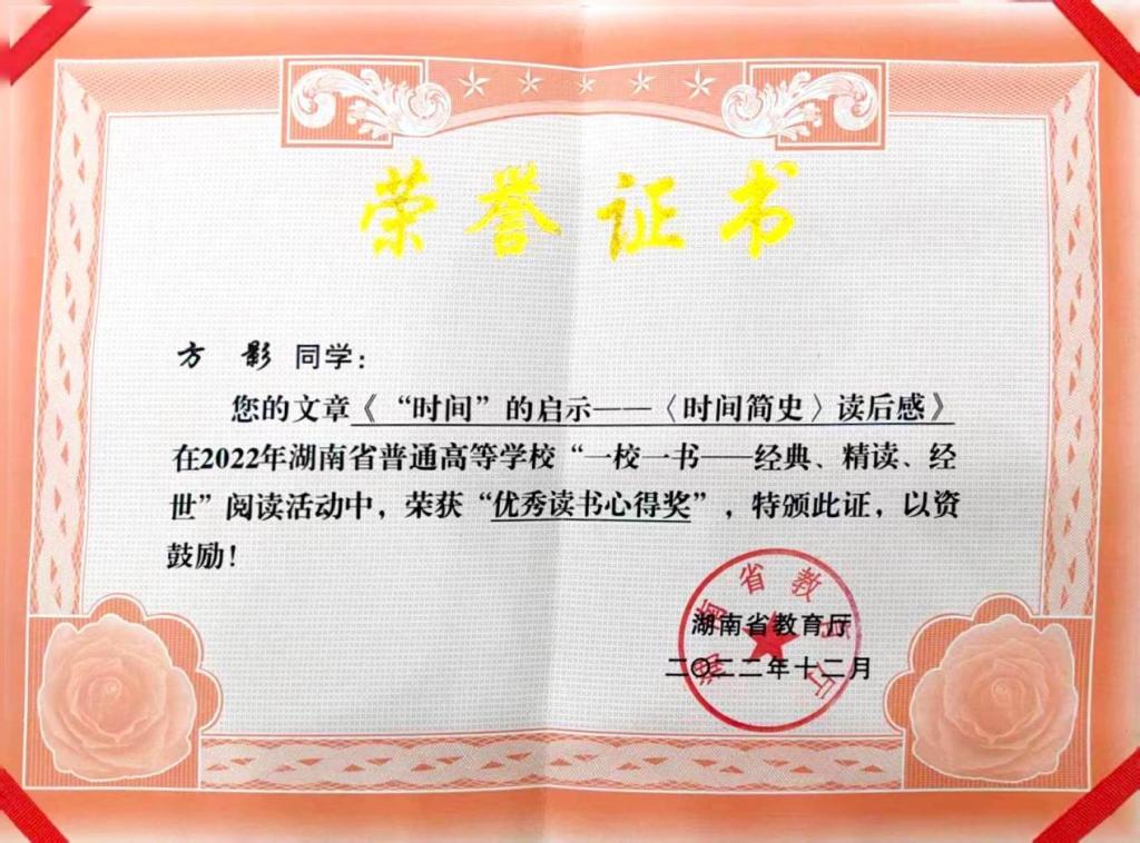 学子方影获湖南省“优秀读书心得奖”,汤浩文在2023年校世界读书日系列活动中被评为“十佳读书之星”。