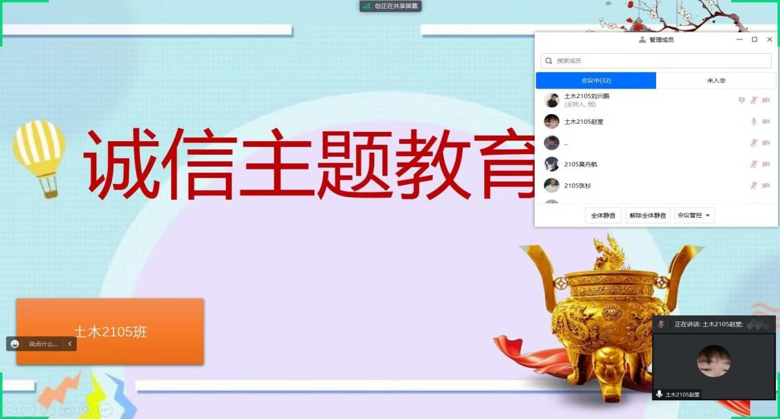 为培育和践行社会主义核心价值观,大力弘扬诚信文化,切实提升学生的诚信品质、自律意识和社会责任感。5月31日晚,我院全体学生以线上、线下的方式同步开展诚信主题班会。