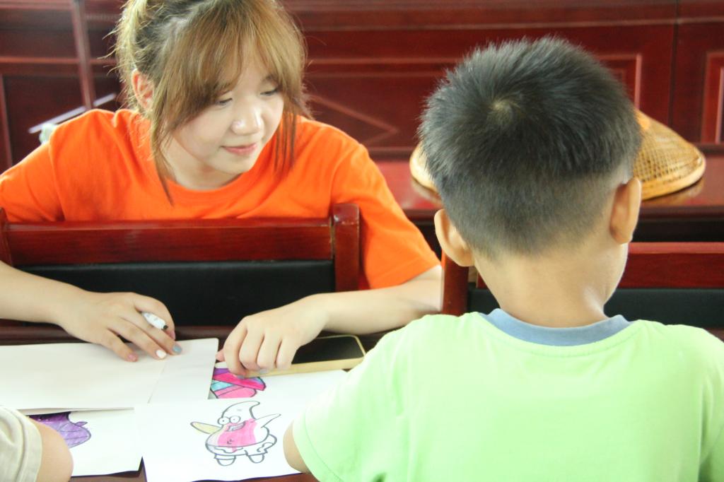 在绘画教学中,实践团成员引导小朋友们画自己喜爱的事物,一节课的时间,小蜜蜂、小老虎、小汽车纷纷跃然纸上,小朋友们乐在其中。