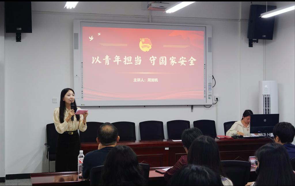 团课讲解:深化国家安全理念。伴随着青春朝气的《光荣啊,中国共青团》歌声,活动正式拉开帷幕。工程管理2202班何欣通过PPT讲解了国家安全相关知识,带领团员青年们学习真实案例,强化安全意识、提升安全素养。随后院团总支书记周洳帆讲授《以青年担当 守国家安全》主题团课,她从“一句话”、“一张图”、“一辈子”向大家分享了三位青年守护国家安全的故事,她结合我国在国家安全方面取得的历史性成就,深入剖析了国家安全的内涵和外延。周洳帆还强调了大学生在维护国家安全中的责任与担当,要自觉抵制各种危害国家安全的行为,用实际行动践行“请党放心,强国有我”的庄严承诺。