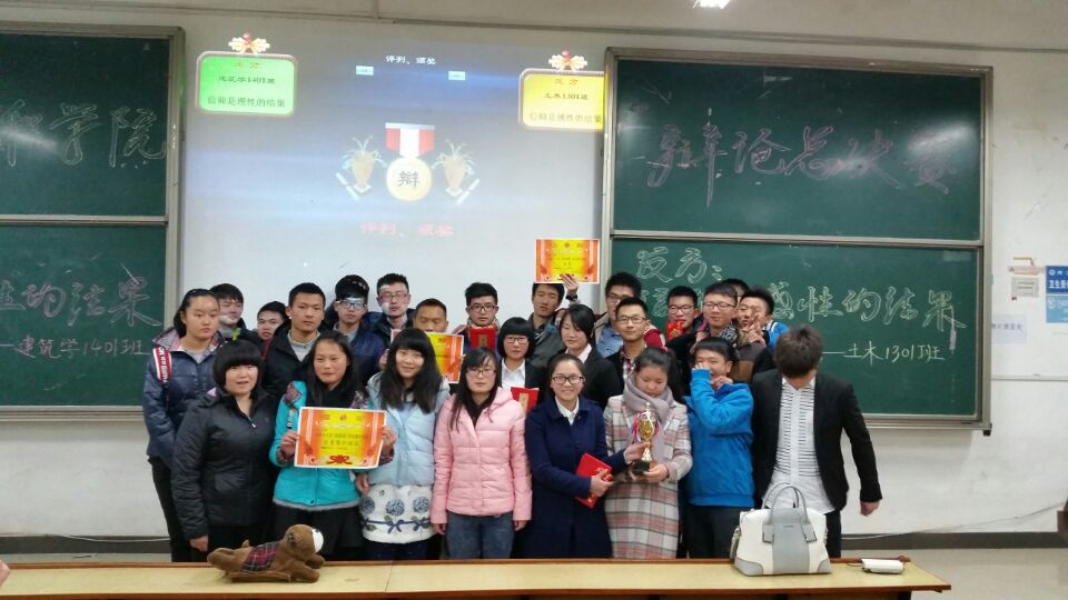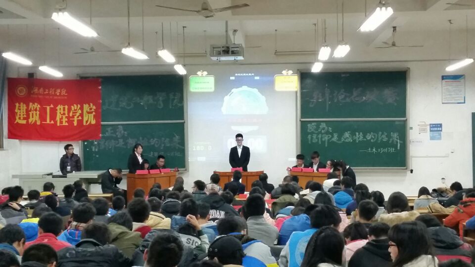 新校区D栋101教室,建工学院2014年下学期班级辩论赛决赛在此展开。来自建筑学1401班和土木1301班的两支辩论队伍将就“信仰是理性的结果”与“信仰是感性的结果”的辩题进行了一番唇枪舌战的辩论。最后,所持观点为“信仰是的感性结果”的一方——土木1301略胜一筹,摘取了本场比赛的桂冠。终于,建筑工程学院2014年度辩论赛也随着土木1301班的获胜而落下了帷幕。