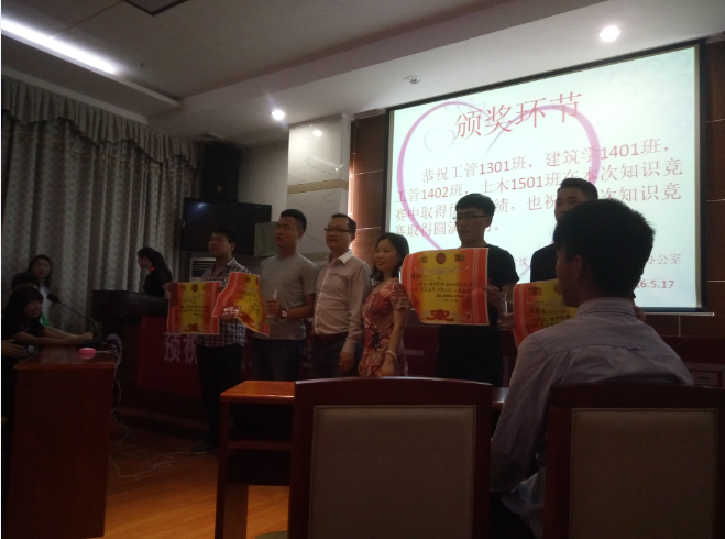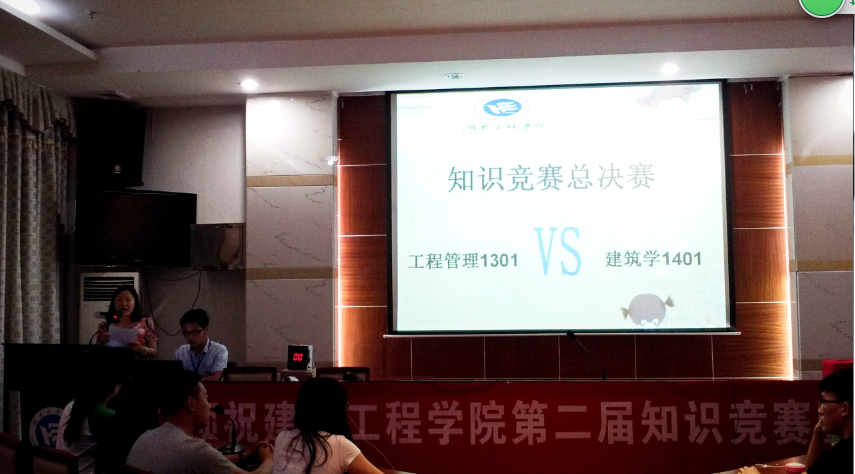 2016年5月17日晚7:30,建筑工程学院于新校区中层干部会议室进行第二届知识竞赛总决赛,进入决赛的班级分别为工程管理1301班和建筑学1401班,莅临本次活动的领导有建筑工程学院党总支书记谢治民书记,学生工作办公室主任李佳老师,团总支书记唐喜梅老师,到场的有建筑工程学院团总支学生会全体干部干事以及比赛双方班级成员。