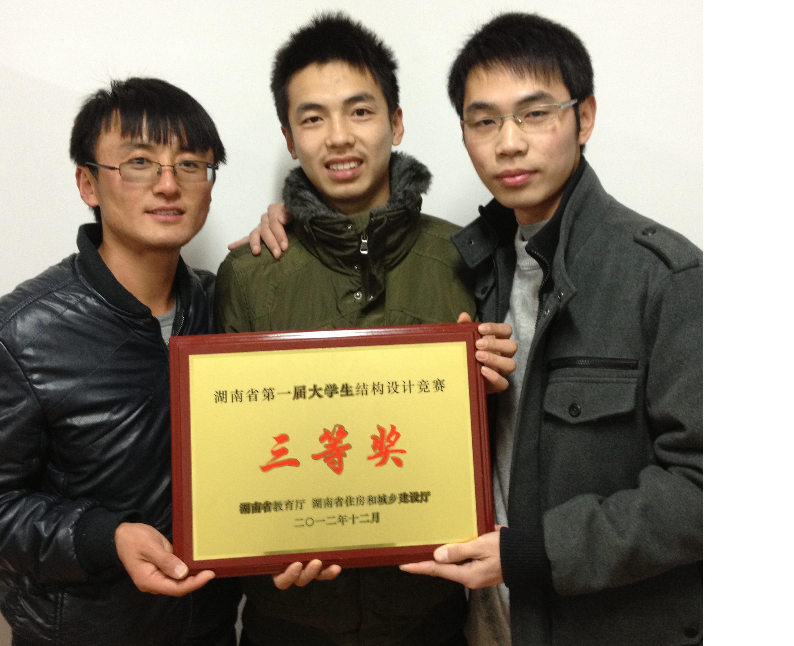 由彭利英、欧阳祥森、王军、陈爱军、任振华等老师指导的建筑工程学院邓坤笛、周江峰、张贤壮三位同学设计制作的 “劲湘竹韵”大跨度空间结构荣获三等奖