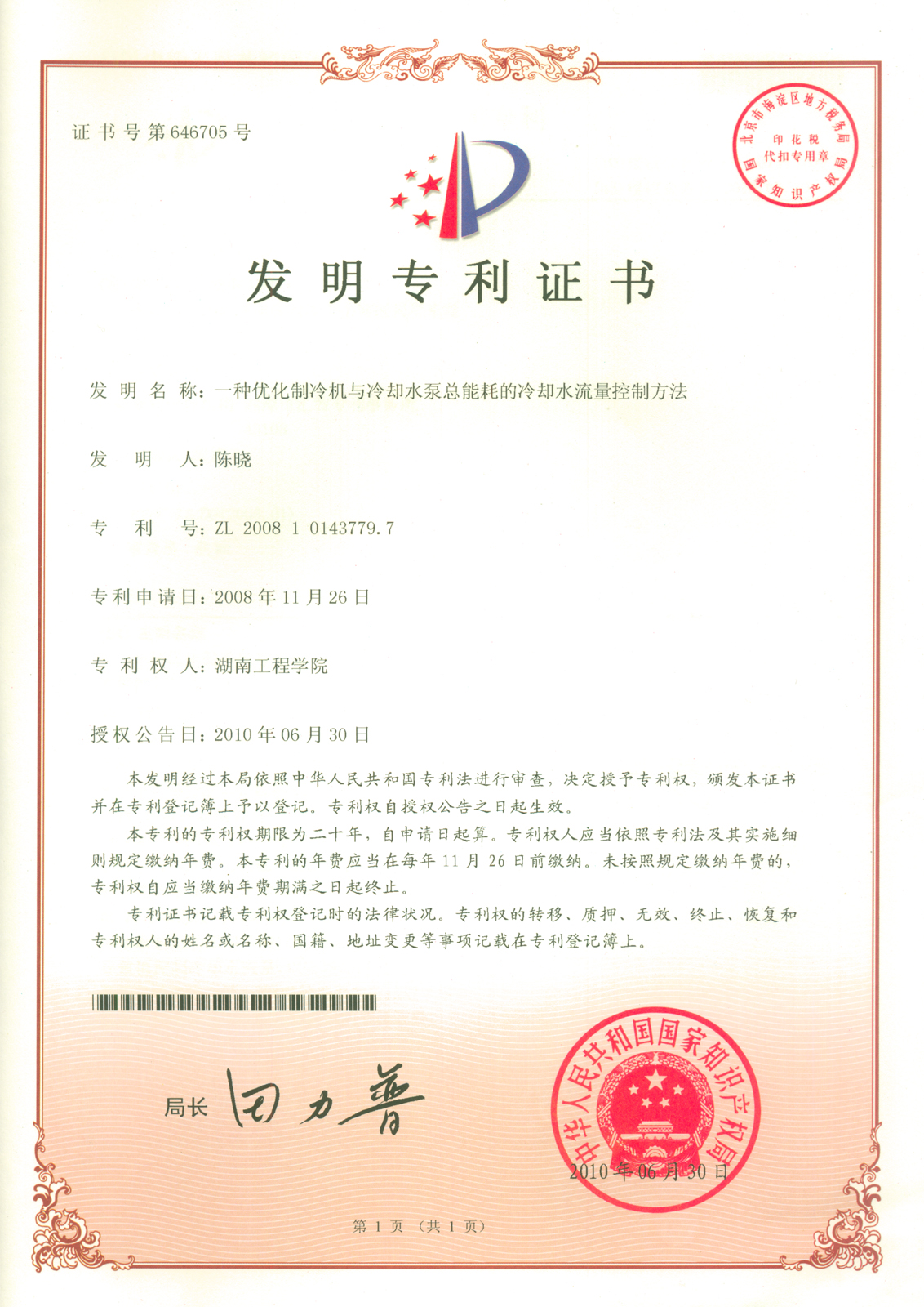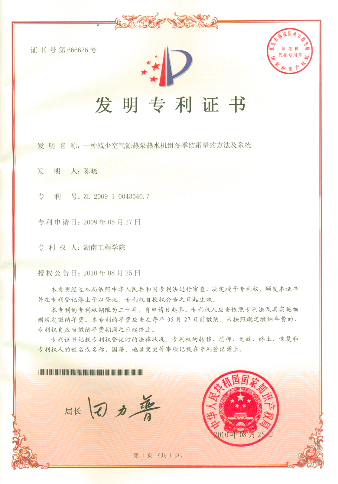 2010年6月,陈晓博士获得了名称为《一种优化制冷机与冷却水泵总能耗的冷却水流量控制机构》的专利,专利号为:ZL 2008 1 0143779.7。2010年8月,他又获得一项专利,名称为《一种减少空气源热泵热水机组冬季结霜量的方法及系统》,专利号为:ZL 2009 1 0043540.7)。
