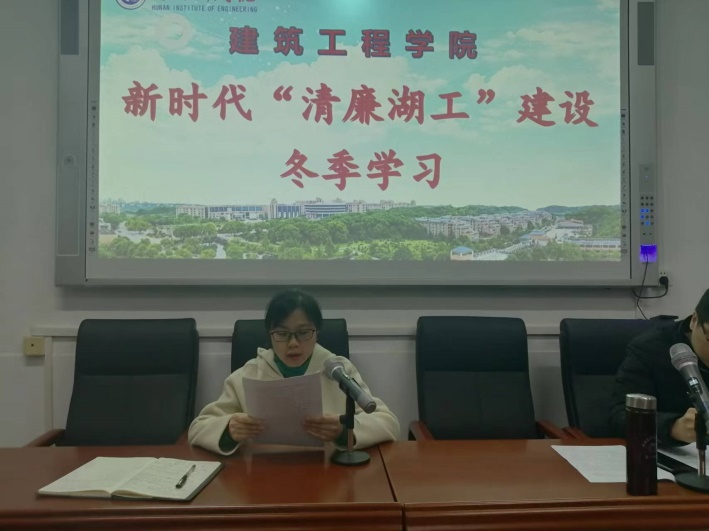 为了对标清廉湖南建设要求,立足学校实际,扎实开展“清明政风、清净校风、清正教风、清新学风”四大行动,逐步建设“崇清尚廉”的清廉校园。11月29日下午,学院全体教职工在三教304会议室开展学习了“清廉湖工”建设专题学习之冬季篇的学习。