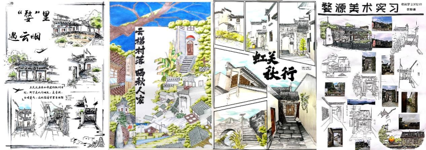 通过此次实习,学生们对徽州传统民居的建筑风格、街巷空间和装饰细节有了更直观的感受。写生训练不仅提升了学生们的科学观察能力、理性分析形体的能力、绘画技能和综合表现力,而且在教师的点评指导下,学生们深刻理解了徽派传统民居的智慧、民居建筑的风格特征与历史文脉、村镇肌理与地理风土、构造细节与节能智慧,以及乡村景观与民俗传统之间的紧密联系。