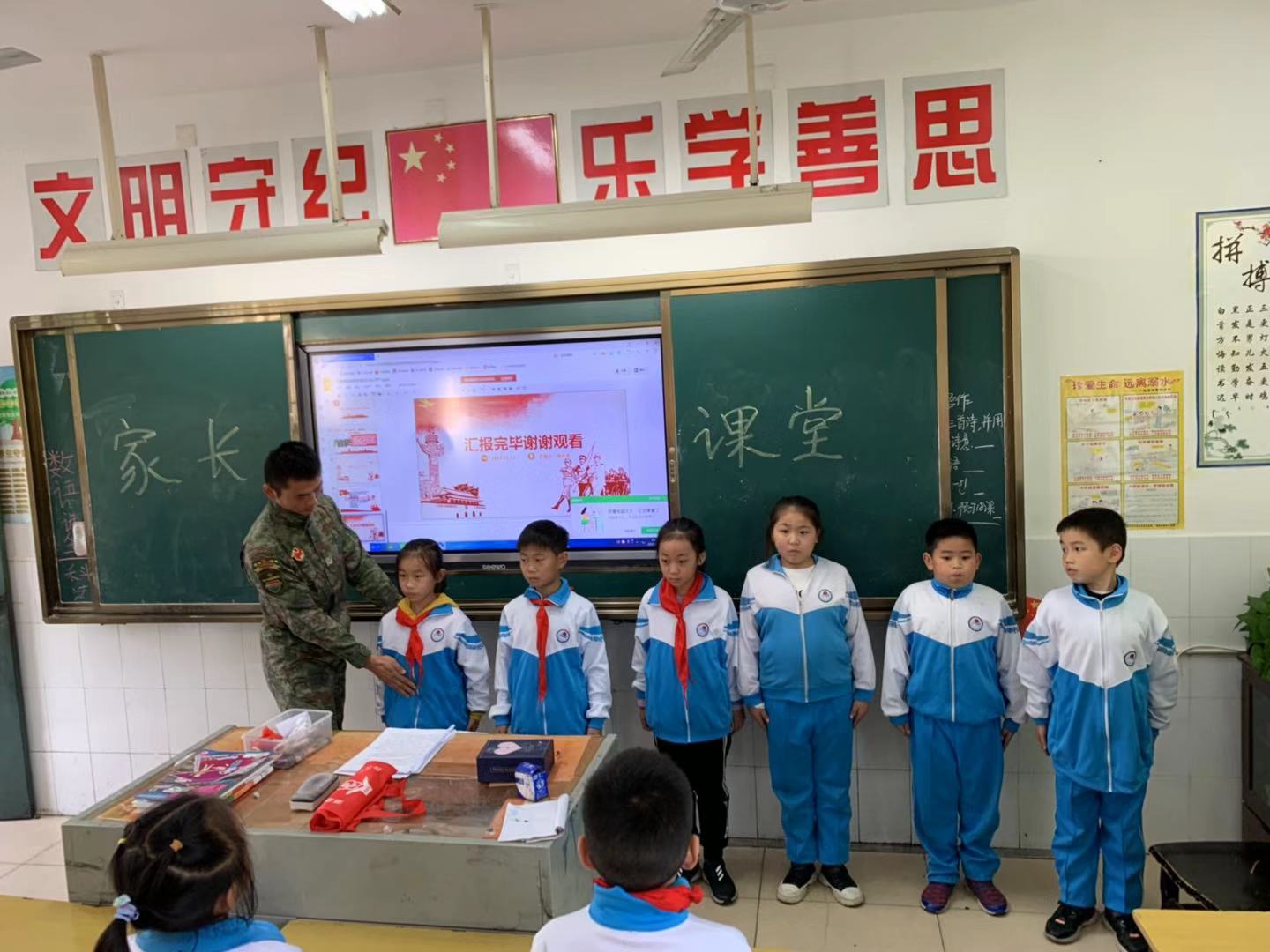 2019年11月14日下午,在湘钢三校三年级1702班的家长课堂上,刚刚参加完70周年国庆大阅兵的麻豆成人